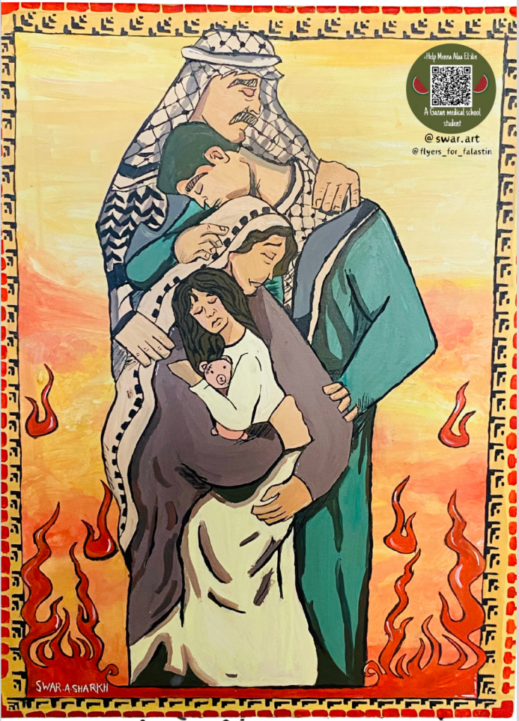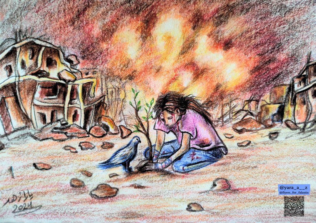 Ilustrasi pada laman ini (selain banner dan peta) adalah karya para seniman Gaza yang dikumpulkan oleh Flyers for Falastin. Nama dan akun IG masing-masing dibubuhkan pada tiap karya, juga QR code ke penggalangan dana untuk seniman tersebut. Menyumbanglah untuk menghargai karya mereka jika mampu. Terima kasih.