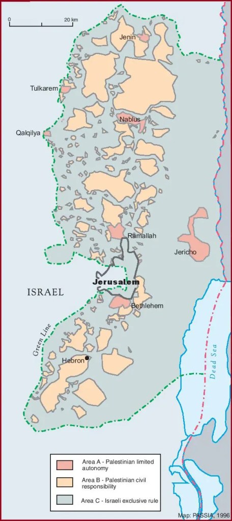 Awalnya, perjanjian sementara Oslo dan Otoritas Palestina dimaksudkan untuk bersifat transisi, hanya berlangsung selama 5 tahun menjelang kesepakatan akhir. Namun, bentuk kesepakatan akhir ini tidak pernah secara konkret didefinisikan sebagai negara bagi rakyat Palestina. Oslo II justru menghasilkan pembagian Tepi Barat menjadi tiga wilayah, yang diberi label A, B, dan C.