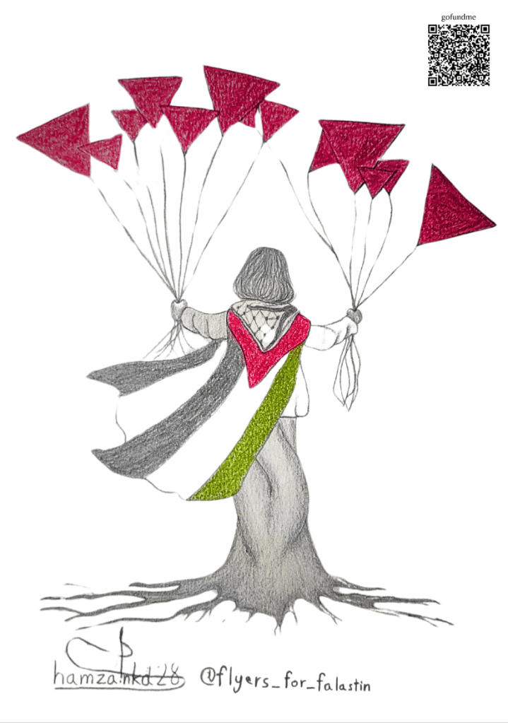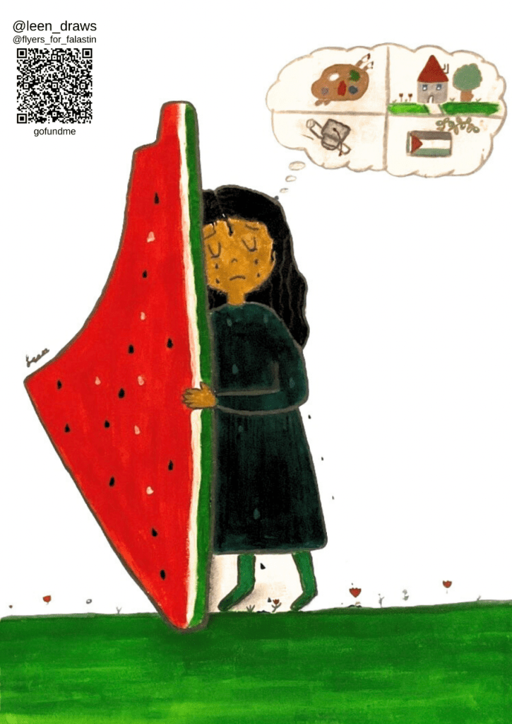 Ilustrasi pada laman ini (selain banner dan peta) adalah karya para seniman Gaza yang dikumpulkan oleh Flyers for Falastin. Nama dan akun IG masing-masing dibubuhkan pada tiap karya, juga QR code ke penggalangan dana untuk seniman tersebut. Menyumbanglah untuk menghargai karya mereka jika mampu. Terima kasih.